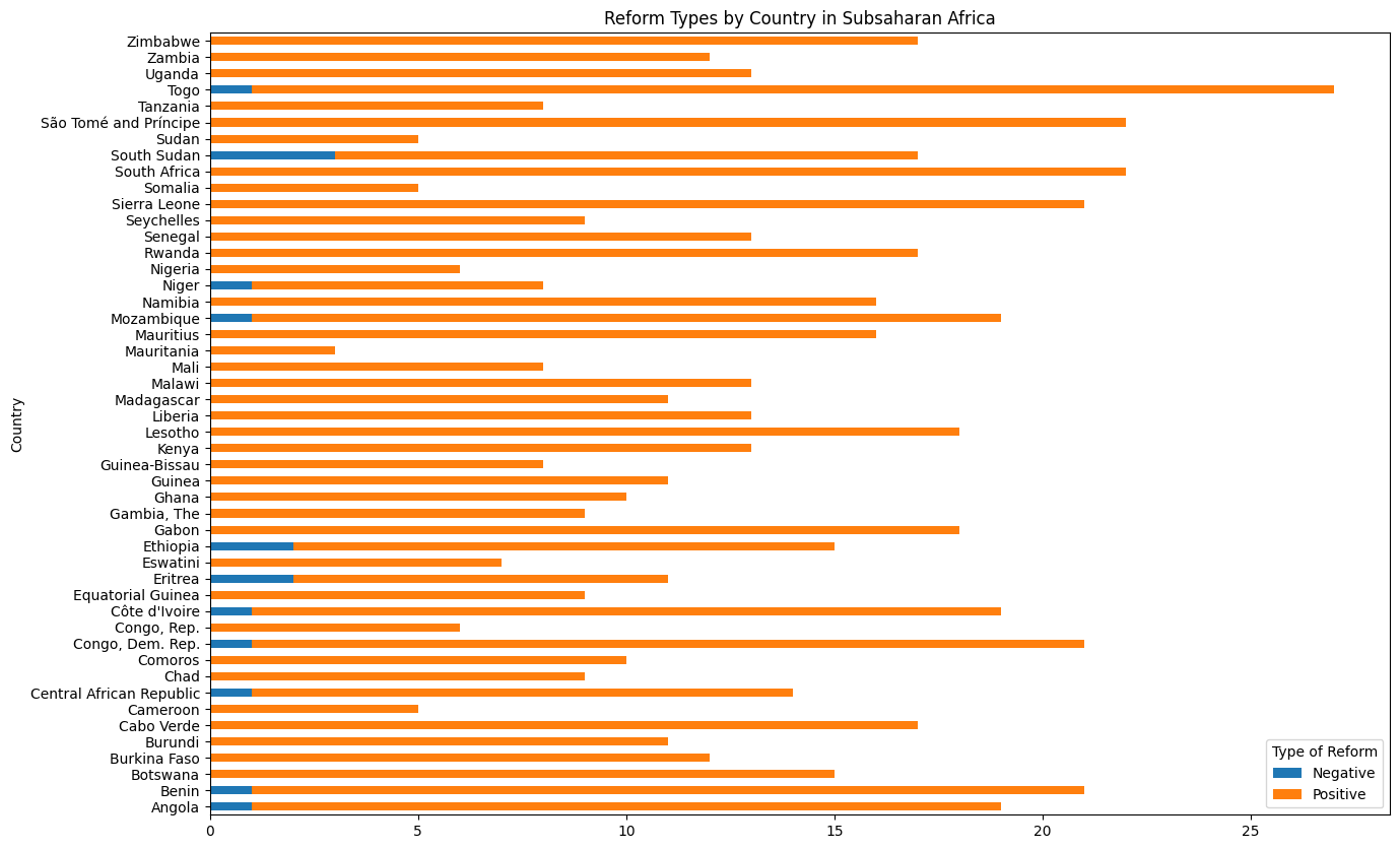 Text(0.5, 1.0, 'Reform Types by Country in Subsaharan Africa')